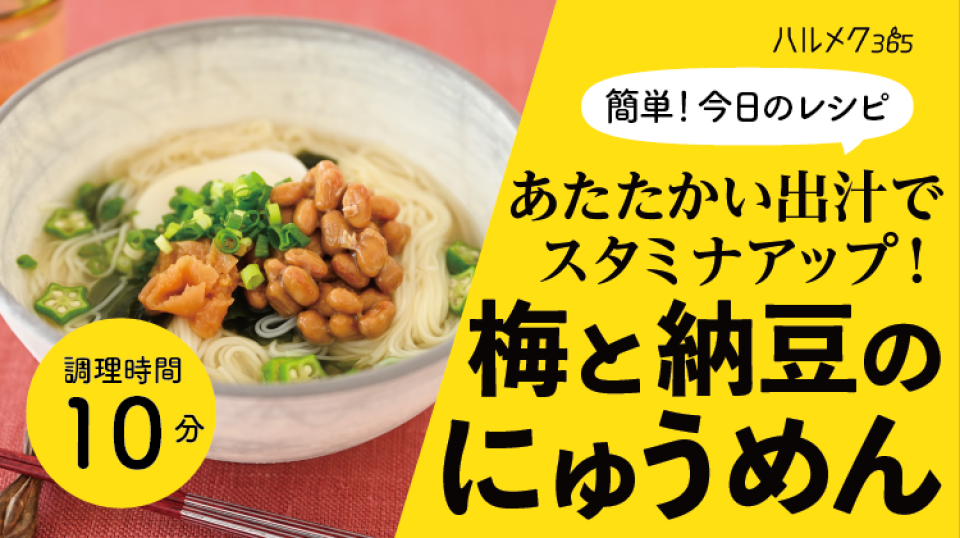 元気が出ないときは、あたたかいにゅうめんがおすすめ。納豆や梅干しが疲れを吹き飛ばし、体力アップに効果的です。