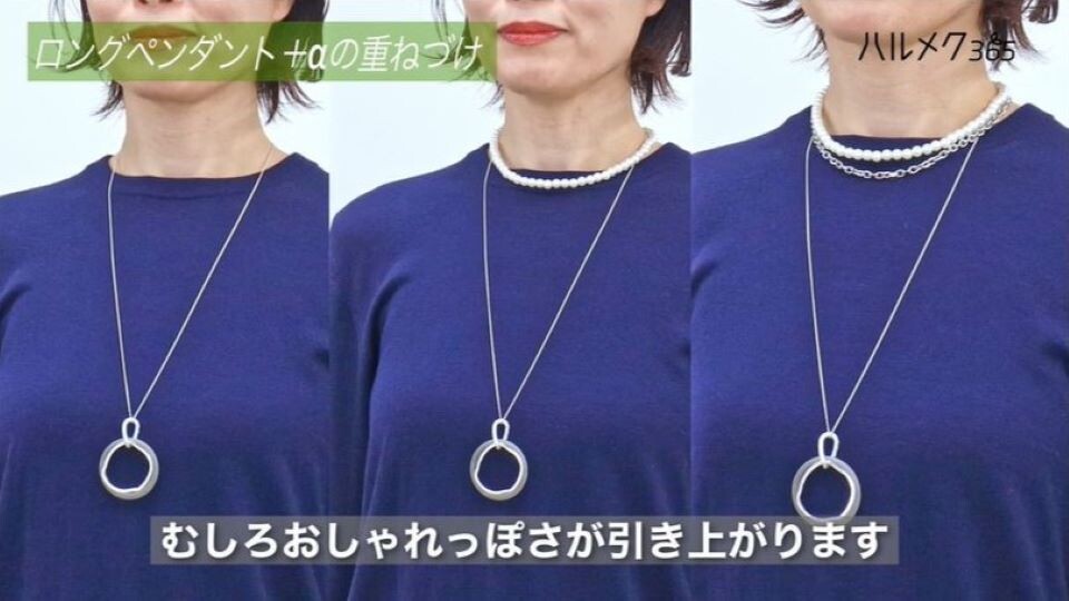 ロングネックレスと短いネックレスの重ねづけのバランスや、超ロングネックレスの上手な使い方をアドバイス。「すっきり見え」にも効果テキメンなので、ぜひお試しを!