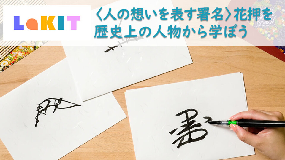花押とは、人柄や想いを表す署名。このレッスンでは、花押の歴史を学んだ後、織田信長や豊臣秀吉など歴史上の人物の花押を筆ペンをつかって書いていきます。