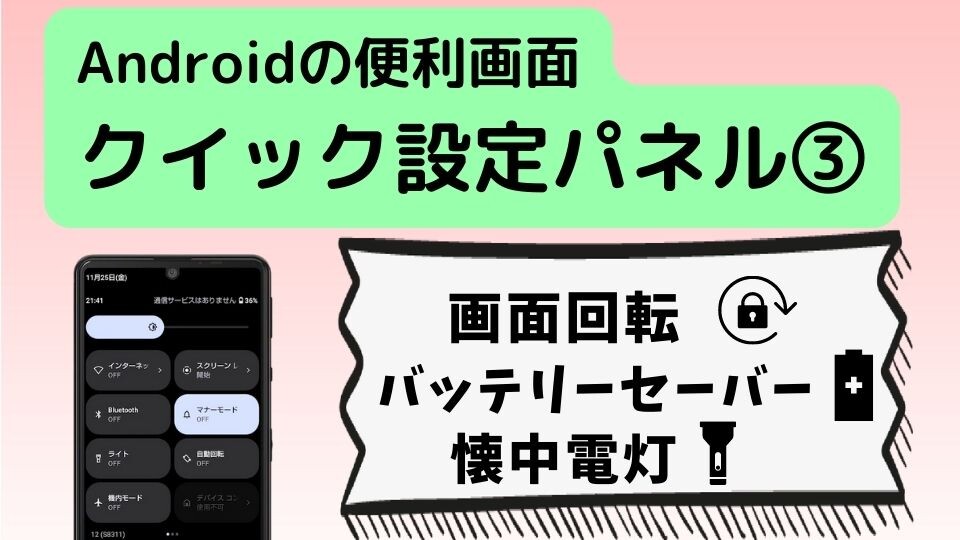 Android便利な機能が詰まった画面「クイック設定パネル」パート3。今回は「クルクル回る画面を止める」、電池の消耗を押さえる「バッテリーセーバー」、「懐中電灯」の設定方法について解説します。