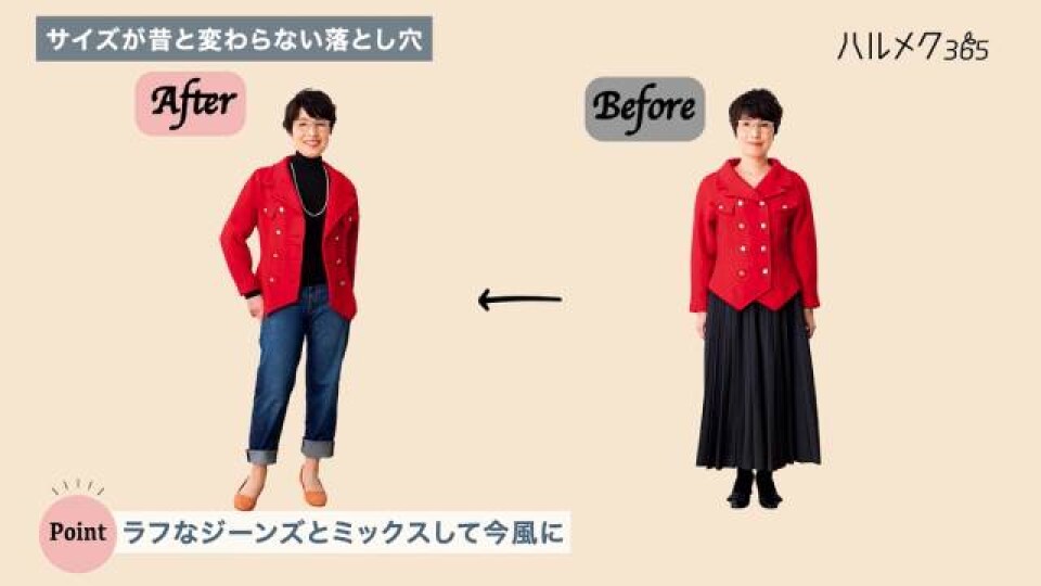 第8回は、「『サイズが昔と変わらない』の落とし穴」がテーマ。若い頃着ていた服を「まだ着られるから」と今までどおりに着続けていませんか?昔の服はひと工夫して着ないと、どこか時代遅れに見えがちです。昔の服を時代に合わせて着こなす方法をアドバイスします。
