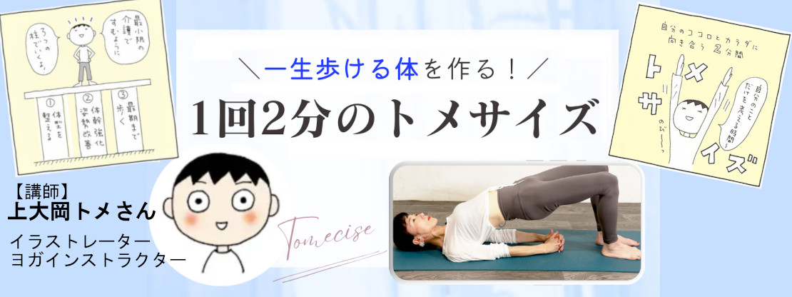 イラストレーター、ヨガインストラクターの上大岡トメさんが1回2分で心と体をケアするエクササイズ「トメサイズ」をご紹介。体型・姿勢・健康な足づくりの3つのテーマで、ヨガをベースにしたエクササイズに挑戦していきます。