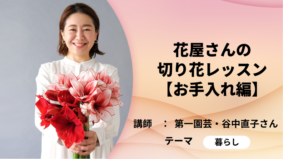 第一園芸のスタイリスト・谷中直子さんが「花屋さんが教える切り花のお手入れ」をレクチャーする全4回。切り花を長持ちさせるには?一輪ずつ素敵に飾るコツ、もらったブーケを長く楽しむ方法、花瓶に生けるだけじゃない楽しみ方をプロに教わります。
